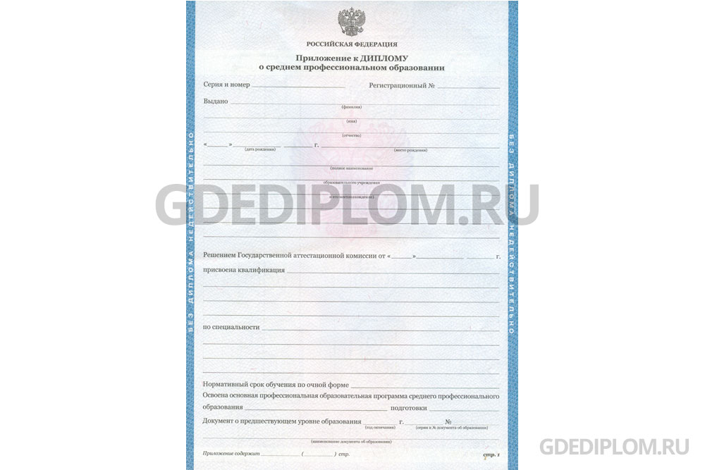 Государственное приложение к диплому о среднем образовании (техникума, колледжа) до 2013 года. Изготавливается на оригинальном бланке гособразца (Гознак), заполняется по стандартам Минобрнауки и выбранного ВУЗа.